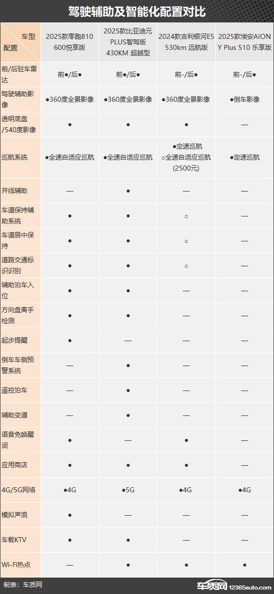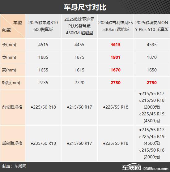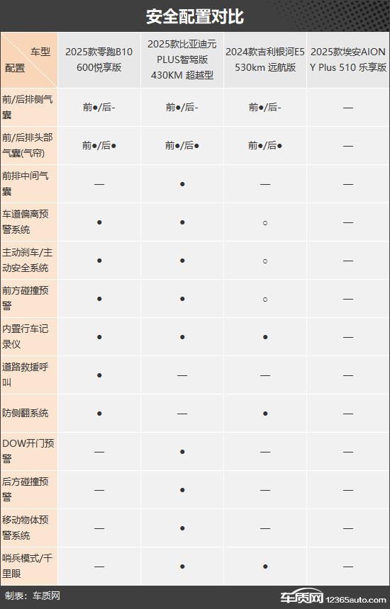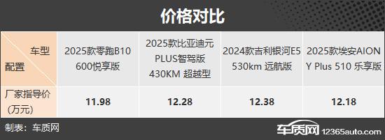 这次选择的四款车分别是 2025 款零跑 B10 600 享受版(以下简称:零跑 B10)、2025 款比亚迪元 PLUS 智驾版 430KM 超越型(以下简称:比亚迪元 PLUS)、2024 款吉利银河 E5 530km 航海版(以下简称吉利银河版) E5)和 2025 款埃安 AION Y Plus 510 乐享版(以下简称埃安版) AION Y)。以上四款车厂商的指导价格比较接近,都在 12 一万左右,而且还定位为同一个目标市场。以上四款车厂商的指导价格比较接近,都在 12 一万左右,也定位为同一个目标市场。(因为现在照片数量少,有些车型的照片不是相应的具体款式)