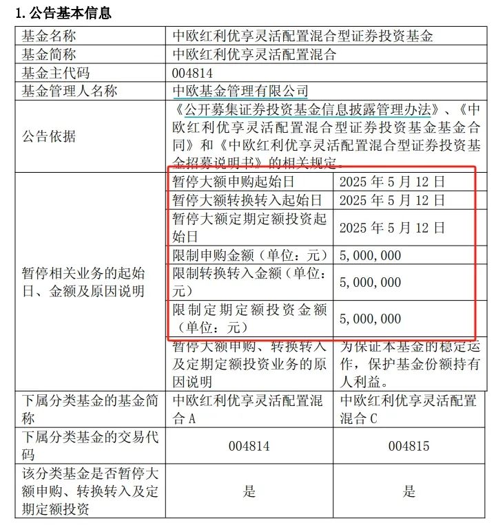 根据中欧基金的公告,从5月12日起,中欧红利享有50万元的灵活配置和限购。限购的原因是“保护基金份额持有人的利益,以保证基金的稳定运行”。