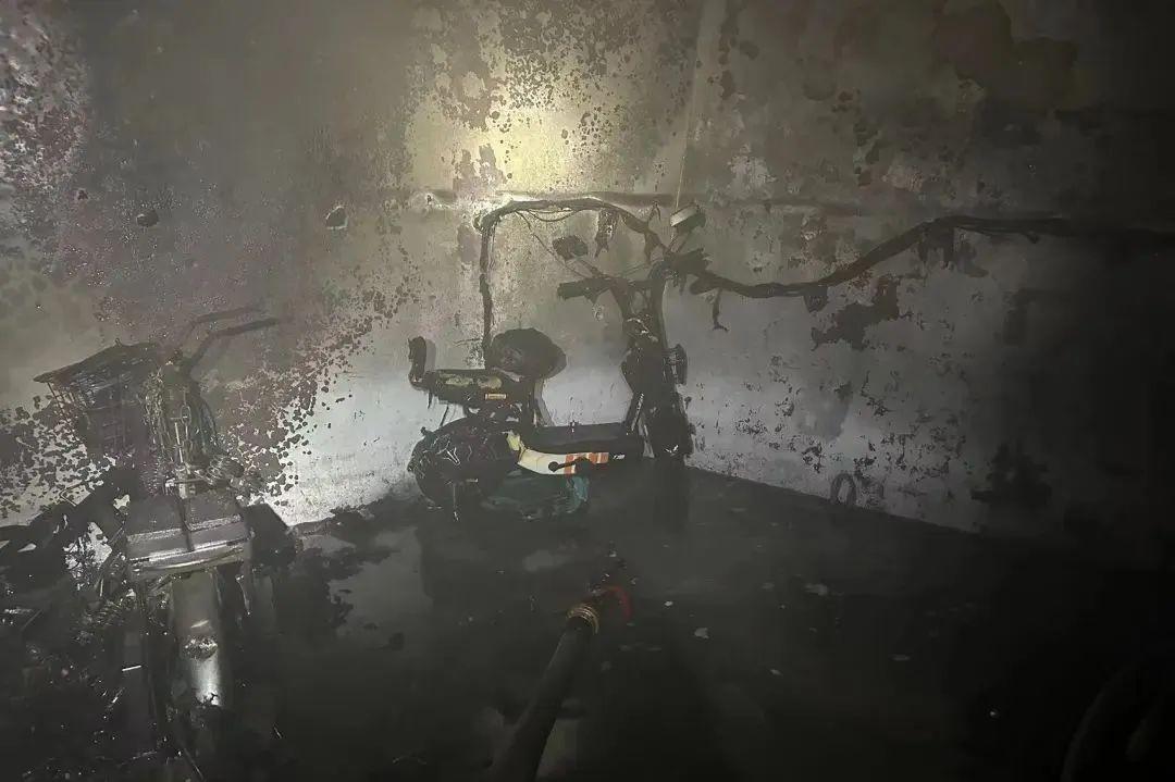 2023年8月10日,厦门湖一辆电动自行车自燃。幸运的是,该建筑的电动自行车停放区与楼梯等场所实施了有效的实心墙防火分隔,成功将火势隔离在一楼。