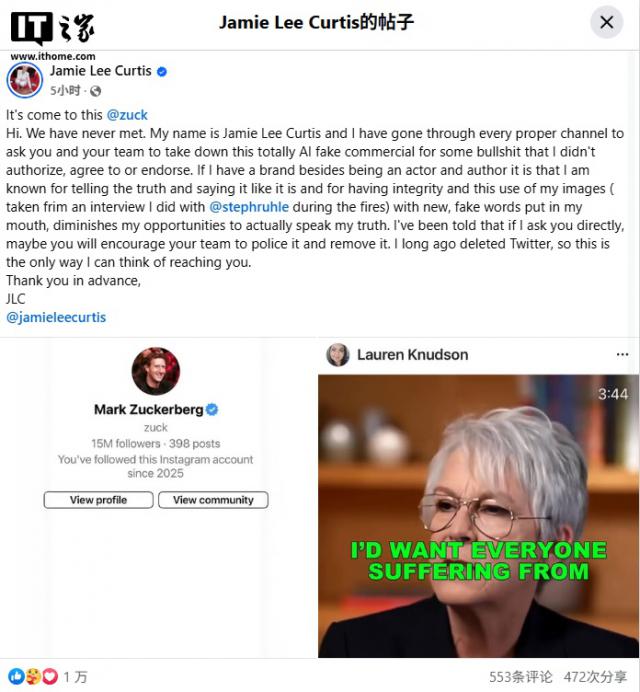IT 世家 5 月 13 日报,著名演员杰米・李・柯蒂斯(Jamie Lee Curtis)通过 Facebook 和 Instagram 公开谴责平台 Meta CEO 马可・扎克伯格要求他删除一个使用者。 AI 深度伪造技术制作的欺诈广告。