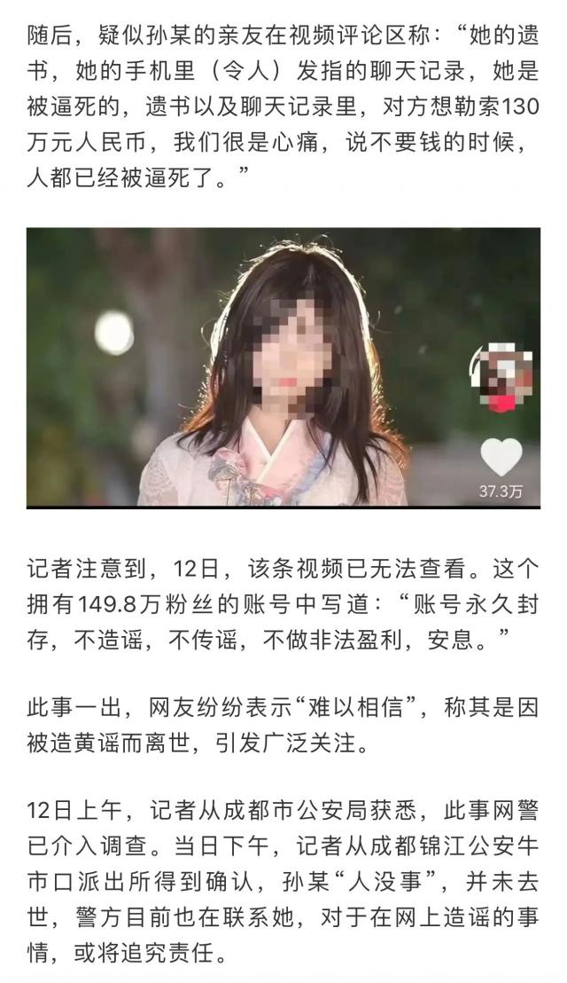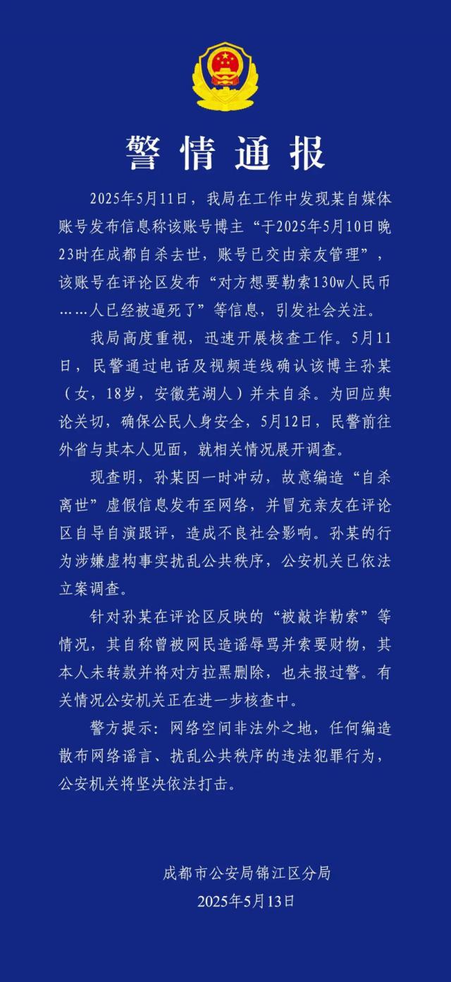 5 月 13 日,成都锦江市公安局发布警情通报:现在发现孙某因为一时冲动,故意编造“自杀死亡”的虚假信息发布到网上,假冒亲友在评论区自编自演,评论,造成不良社会效应。孙某的行为涉嫌虚构事实扰乱公共秩序,公安部门已依法立案调查。
