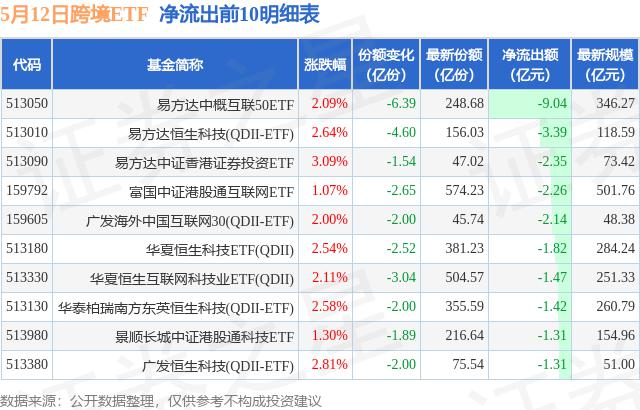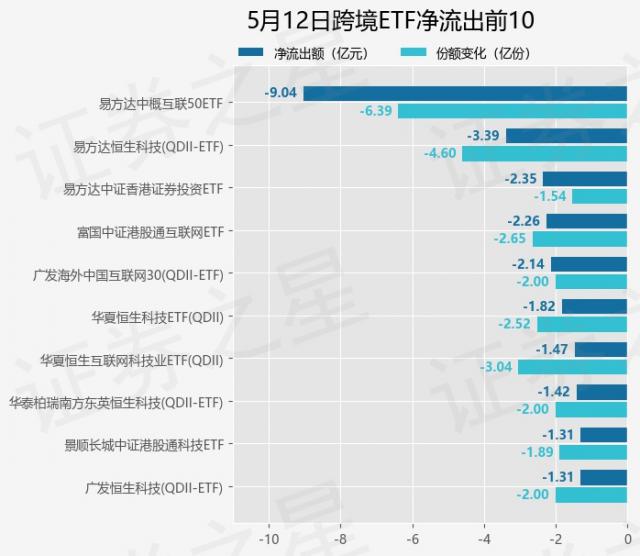 当天有 63 只跨境 ETF 资金净流出,其中易方达中概互联网在净流出中排名第一。 50ETF(513050)减少了份额 6.39 一亿份,净流出额为 9.04 亿元。