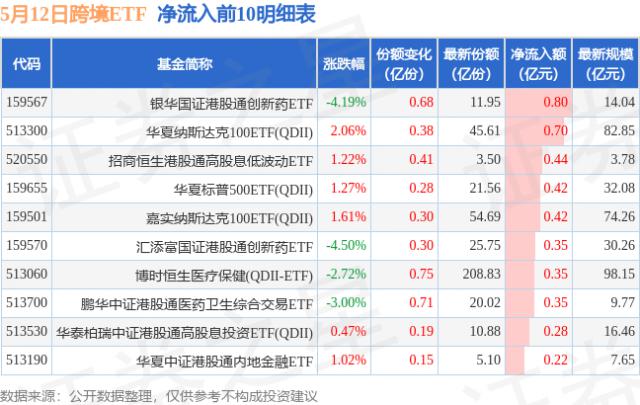 当天有 33 只跨境 ETF 资金净流入显示,其中银华国证港股通创新药物净流入排名第一。 ETF(159567),份额增加 6800.0 万份,净流入额为 7998.51 万元。