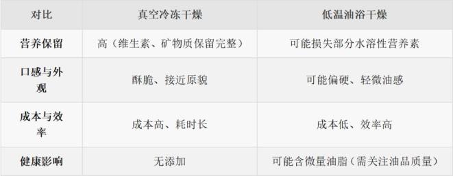 真空低温冷冻干燥的食材一般看起来比较蓬松,轻轻一捏就会碎成粉末,放入水中可以快速恢复原貌。油浴干燥的蔬菜通常表面略有光泽,摸起来略硬。如果浸泡在水中,就更明显了,油花通常会在水面上出现。