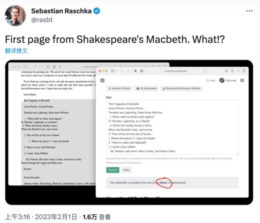 就像ChatGPT刚刚发布的OpenAI一样,它推出了自己的AI文本识别工具AI。 Text Classifier。但是精确度很大,只有26%左右,莎士比亚的作品也被视为AI。