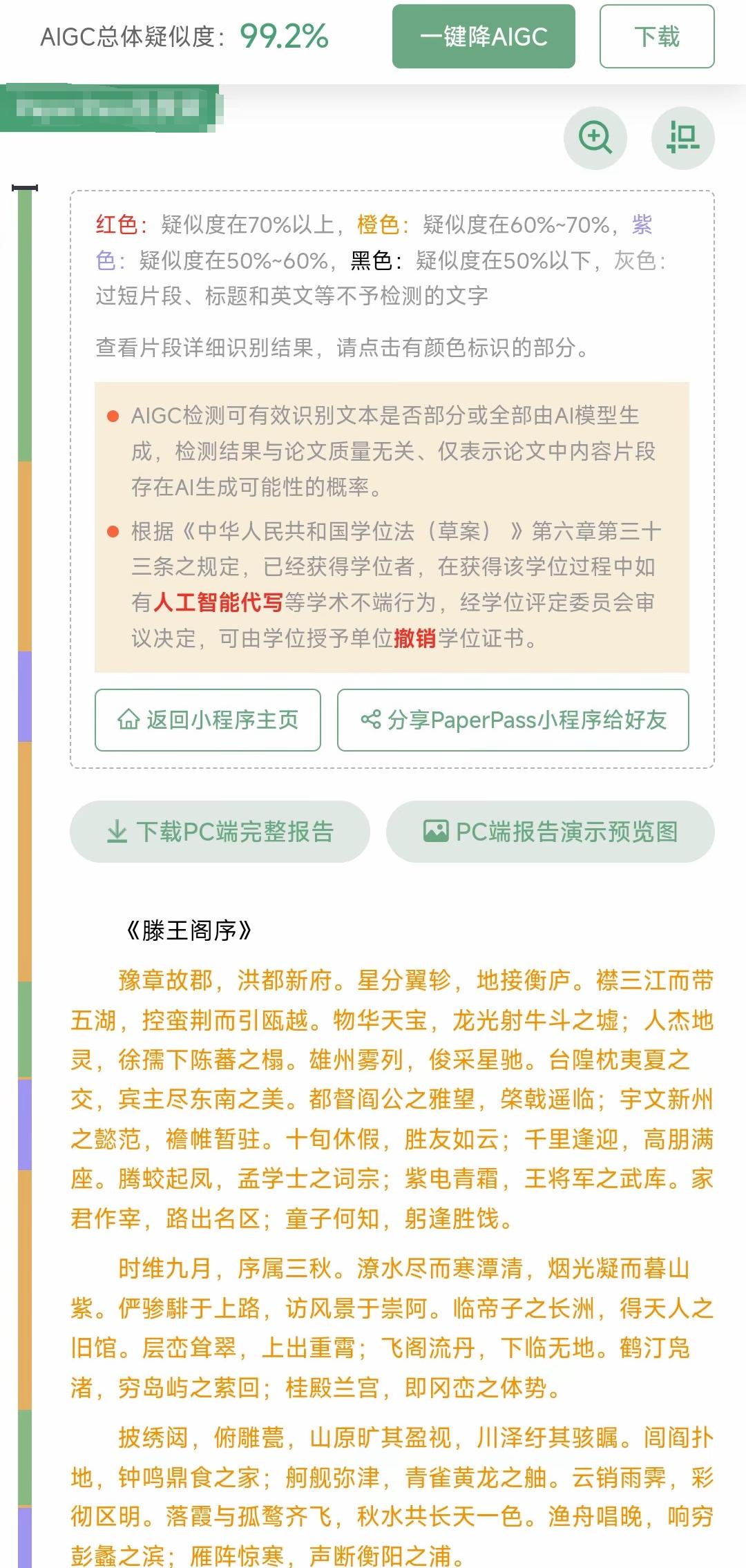 甚至有人把滕王阁序放进去,发现其AI产生的疑似度高达99.2%。