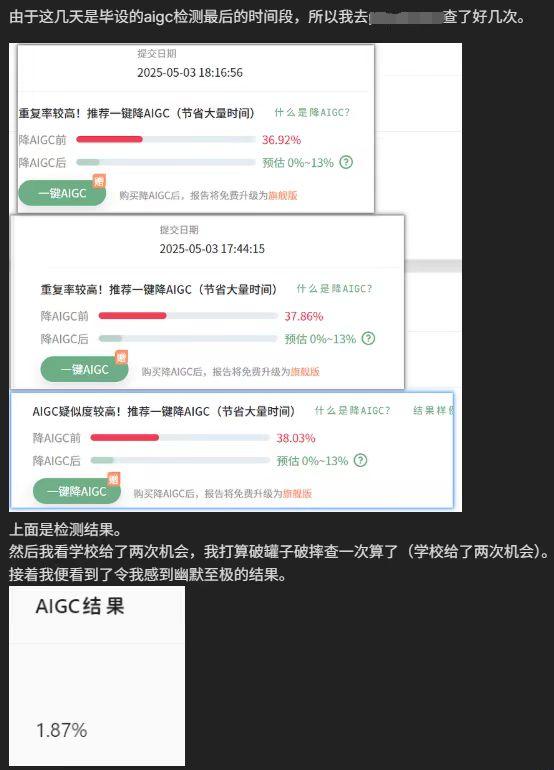 事情是这样的。今年,为了避免学生用AI写毕业论文,许多学校在提交论文时增加了一个“AIGC测试”,这意味着测试你的文章中AI产生了多少内容。