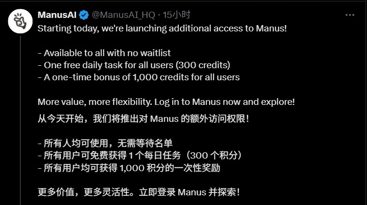 五月十二日晚上十一点,Manus宣布,Manus将从现在开始向所有人开放,不用等待;所有用户将一次性获得1000分,同时,客户每天可以免费获得300分(相当于一次使用)。