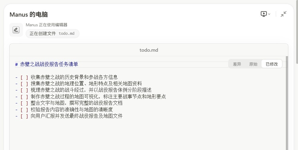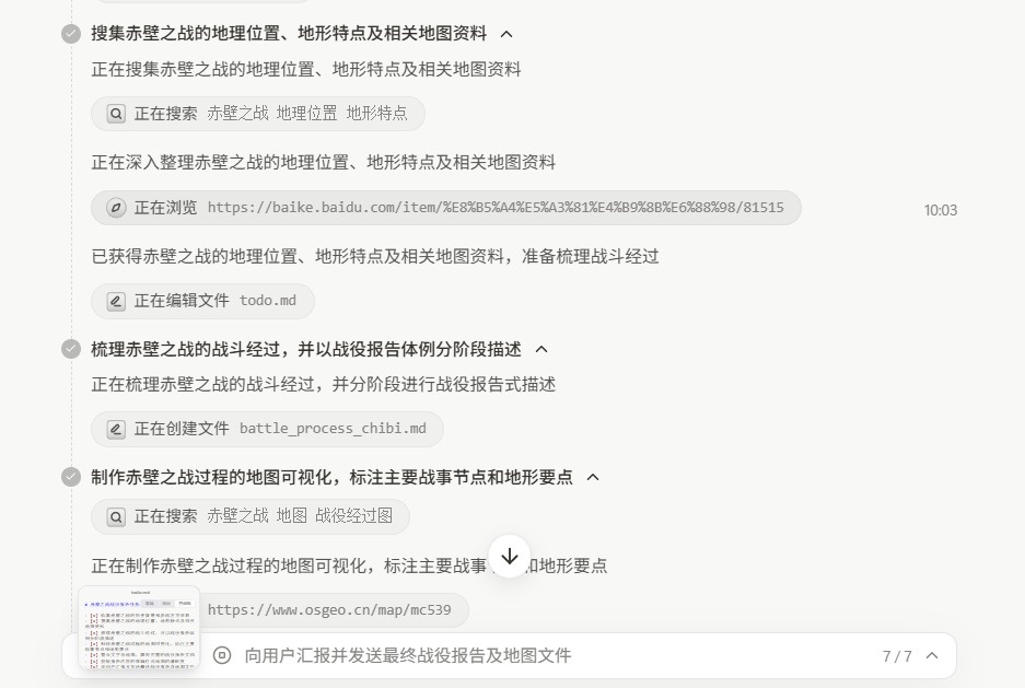 首先,我问了一个关于信息整合方向的问题。让Manus详细讲解赤壁大战,以报告的形式详细描述战斗过程,并结合地图和地形可视化进行解释。