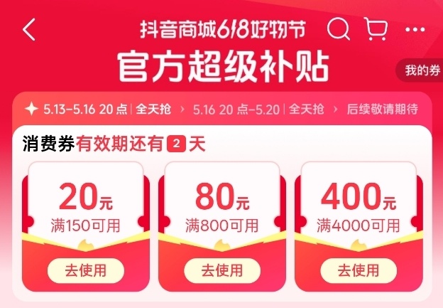 因为这是三大平台中最早开始的,所以抖音的618活动从今天早晨开始就开始发醇,从小雷的经验来看,只要点击查看Tiktok的商城页面,就会直接发放三张优惠券,总金额分为450元和500元两种,其中一张是4000-400元,另外两张是碰运气分配。