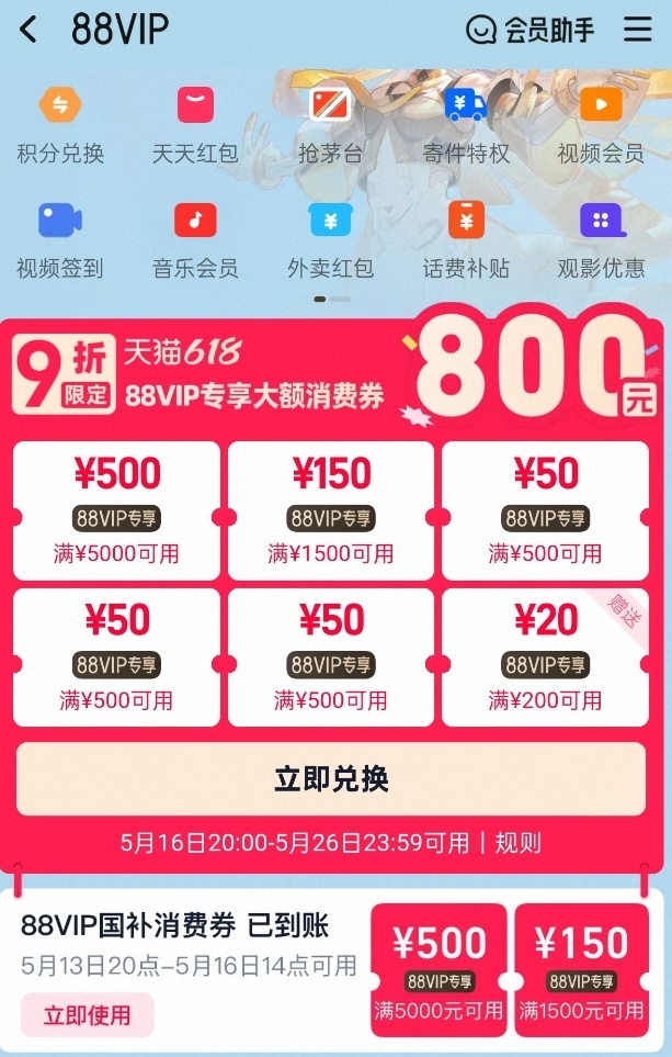 如果是88vip会员,可以用88分换取多张专属优惠券,总金额为800元,此外还有88vip专属国补券。