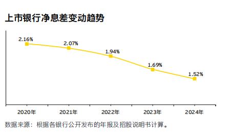 安永发布的《2024年中国上市银行回顾未来前景》报告也证实,由于市场利率持续下降、股票抵押贷款利率下降、实体经济持续让步等因素,2024年上市银行净息差进一步收窄,平均净息差为1.52%,较去年下降17个基点,连续五年下降,近三年净息差均低于2%。2024年上市银行净利息收入同比下降2.20%,受净息差收窄影响,连续2年下降。