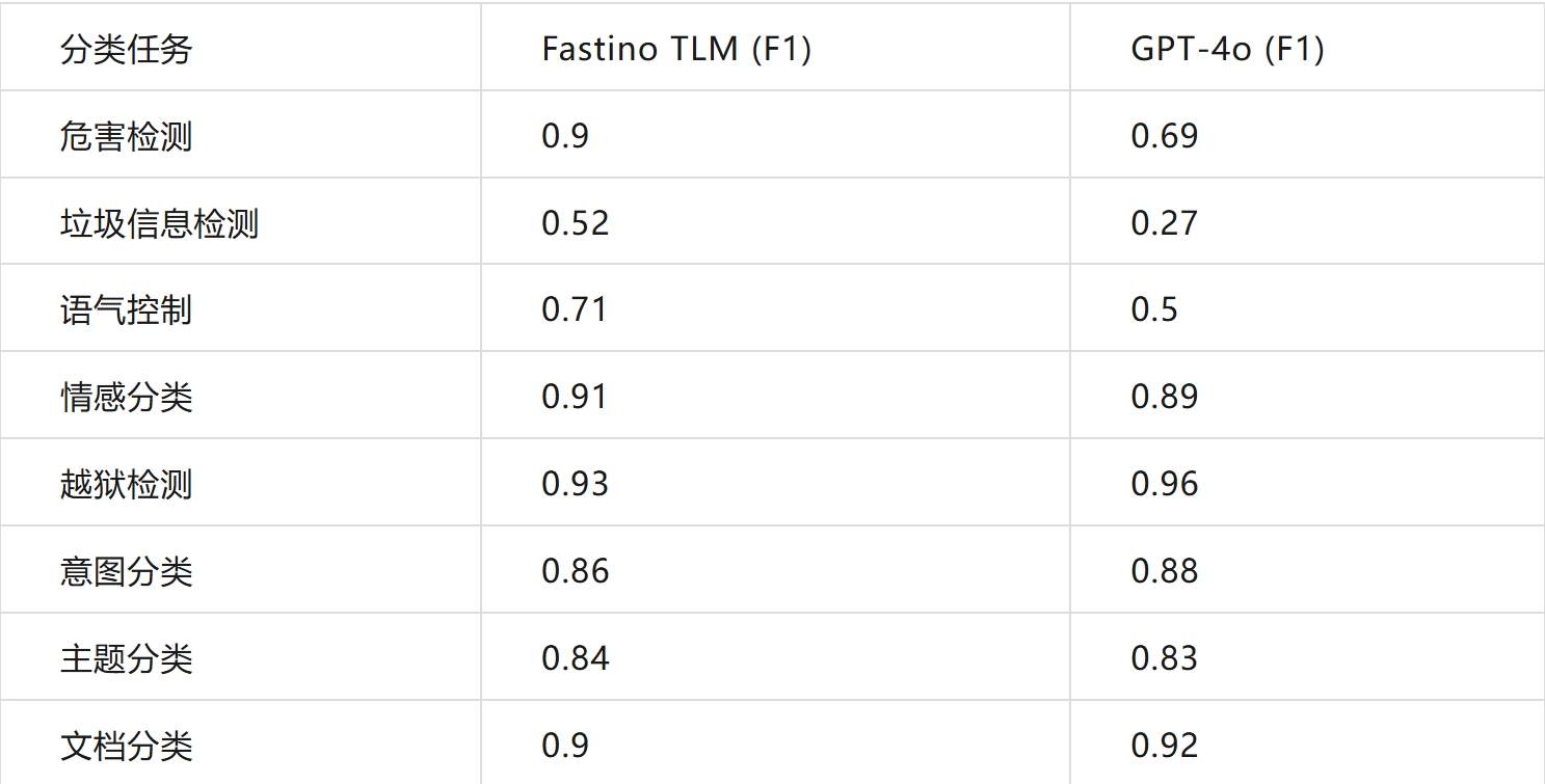 在性能方面,Fastino将TLM模型与OpenAI标杆模型GPT-4o的性能进行了比较,包括意图检验、垃圾信息过滤、情绪倾向分析、有害言论过滤、主题分类和大型语言模型保护。数据显示,其标准特性的F1分数比GPT-4o高17%。