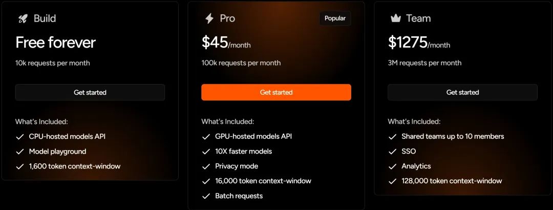 具体来说,对于个人开发者来说,每个月有一万个免费请求,而Pro客户每个月只花45美元,而团队客户每个月有300万个请求和1275美元。Pro客户和团队客户增加了一些优势,比如更快的模型速度、更安全的模型浏览和更多的前后窗口。