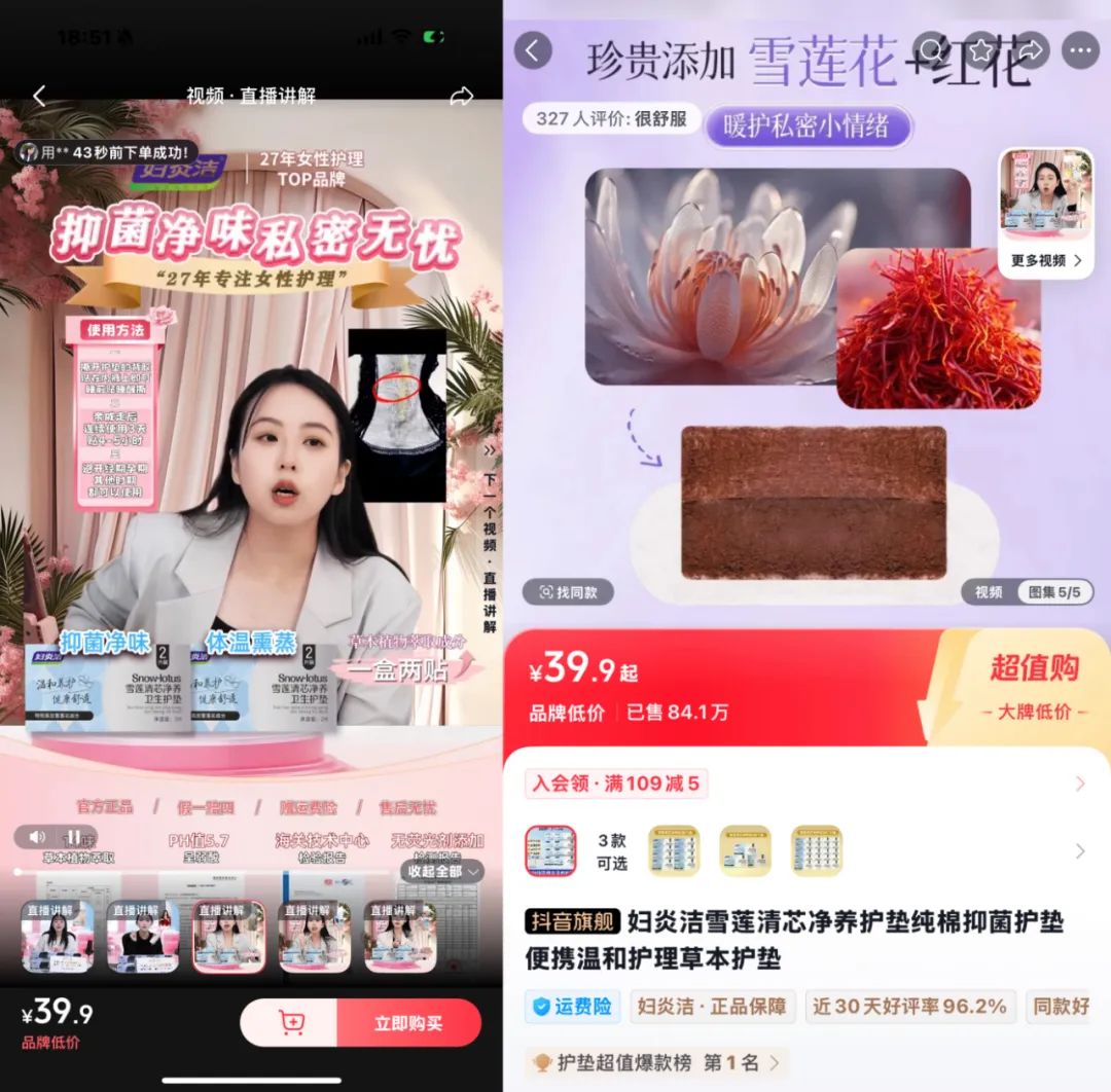 通过对妇炎洁在抖音的操作玩法的研究,可以发现其在抖音中的核心爆款并非卫生巾,而是抗菌护垫、抗菌洗液、抗菌凝胶,与同类产品明显不同;与此同时,妇炎洁还建立了品牌矩阵帐号,品牌直营渠道为其提供了70%的销售额,达人带货比例为30%。