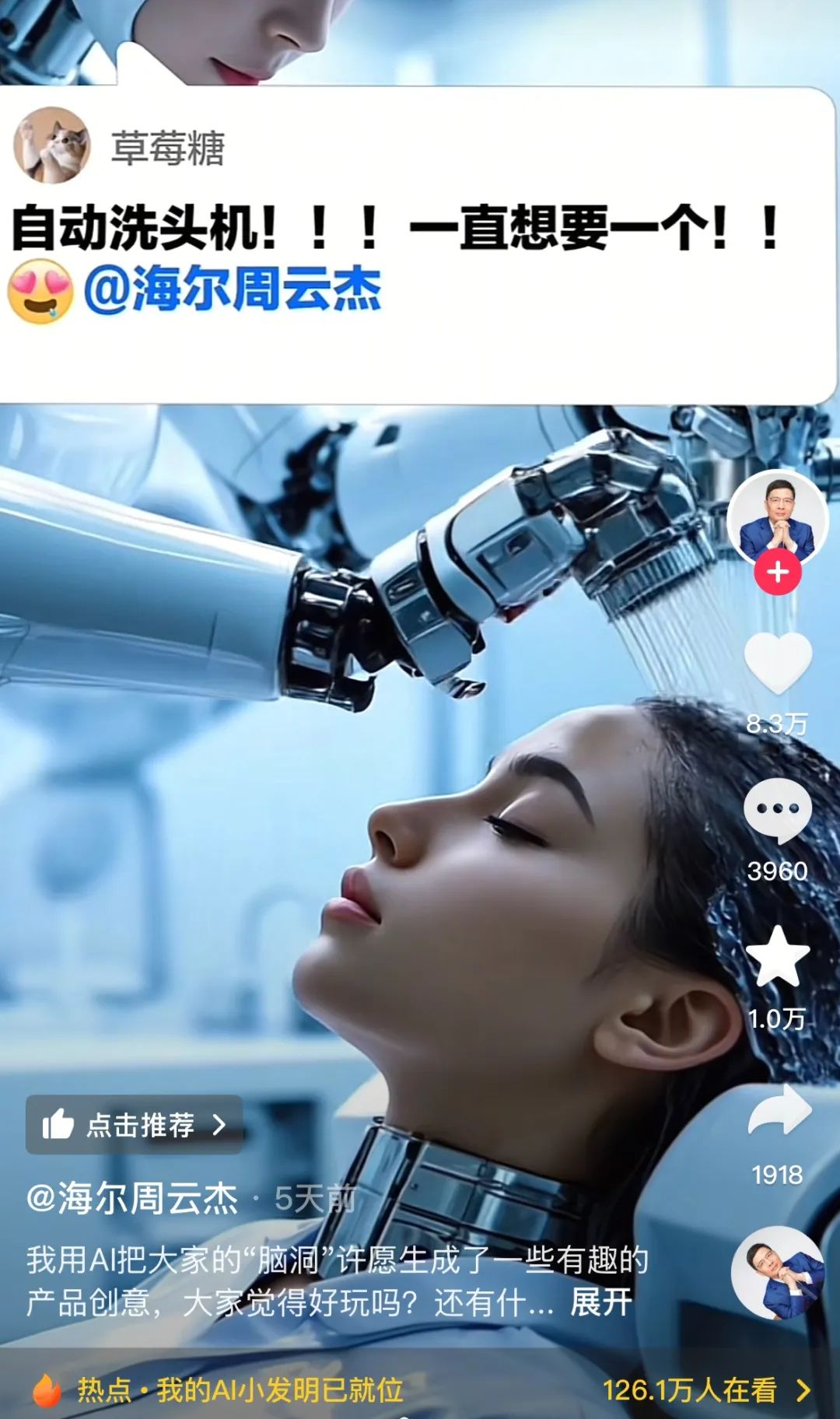 根据官方数据,#我的AI小发明已经到位。 在话题下,已经有1万多个AI投稿作品,海尔总裁@海尔周云杰最近火了。 同时也参与其中,根据网友之前在评论区做的“美梦”,生成了含有表情的洗衣机,可以涂鸦的冰箱,还有自动洗头机。