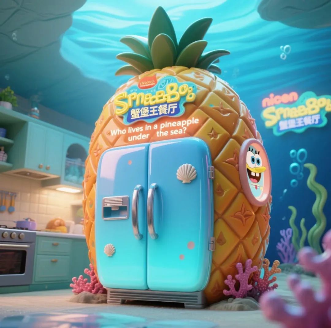 有人把童年的记忆搬出去,设计了一个同样的冰箱,童年的记忆海绵宝宝菠萝屋,让人怀疑是不是开门的时候,看到的不是水果饮料,而是海绵宝宝生活的比奇堡海洋世界。
