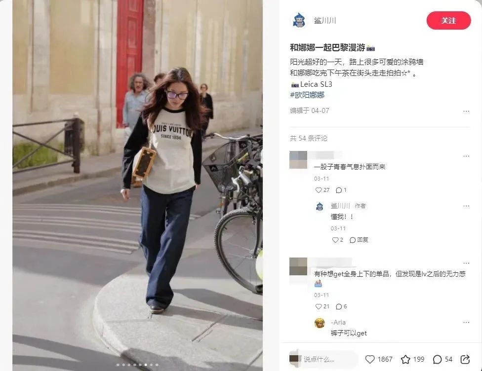 “撕片”合作后,鲨川川”加深了与欧阳娜娜的合作,不仅一起飞往巴黎,还为他们拍摄了机场出发图和秀场出发图。欧阳娜娜手里拿着一个LV包,穿着一件LV毛衣。一组在巴黎街头低头的神图也来自鲨川川。