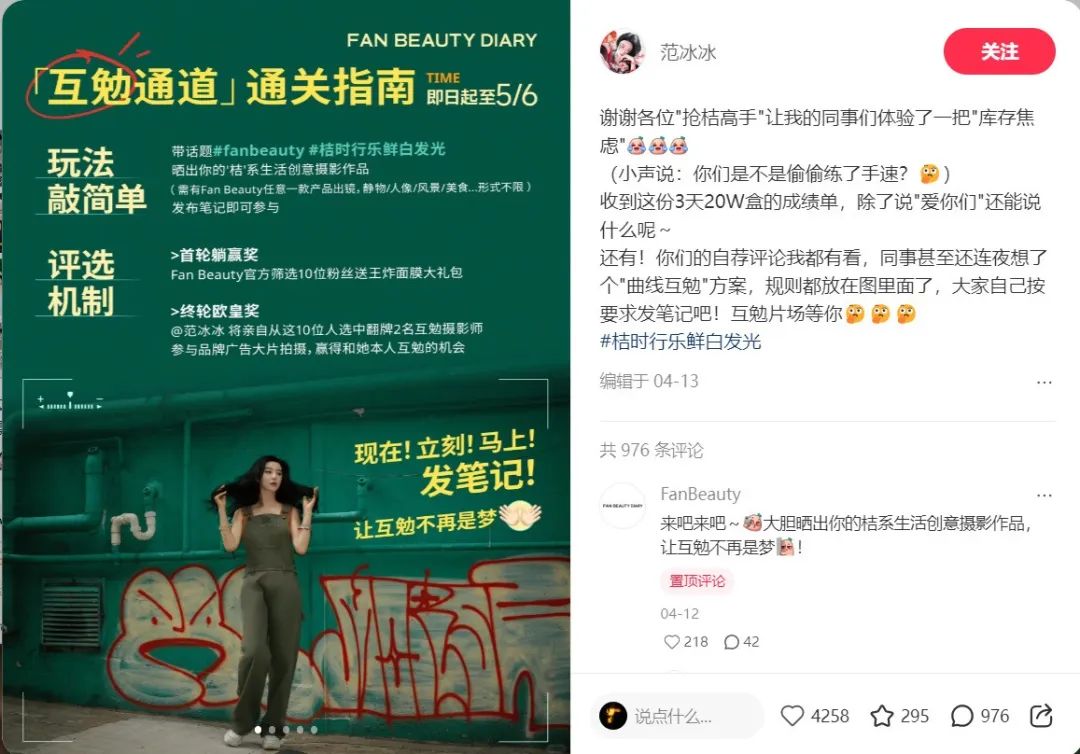 #范爷互相鼓励,翻车#话题访问量迅速突破1亿。随后,范冰冰团队迅速启动了互相鼓励的计划,宣布将再次与“成长摄影师”和“救早见”合作拍摄FAN。 BEAUTY(叶凡自创品牌)口罩广告还同时推出了“橙色生活创意摄影”活动,入选的两位摄影师将有机会与叶凡合作拍摄品牌大片。