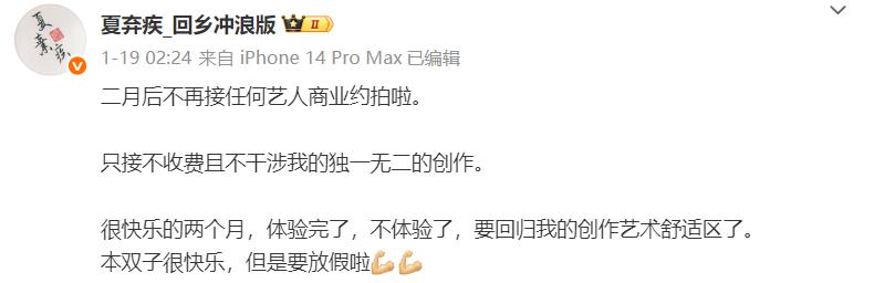 在密集拍摄了虞书欣、文淇、丁禹兮、郑业成、田嘉瑞等艺人后,“夏弃疾”在首页宣布不再接受艺人的商业约拍。