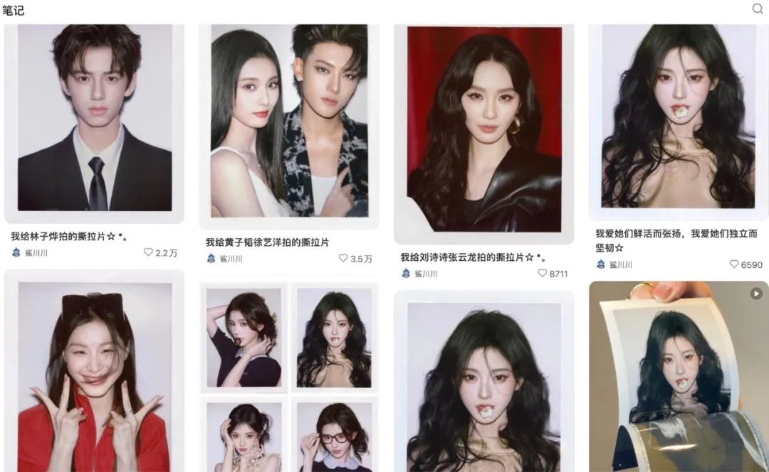 与欧阳娜娜的深度合作爆发后,“鲨川川”完全闯入娱乐圈,开始与艺人大规模合作,为古力娜扎、鞠婧祎、刘诗诗、虞书欣、金靖、黄子韬、徐艺洋、林子烨、陈昊宇等艺人拍摄“撕片”,成为小红书中拍摄“撕片”最火的摄影师。