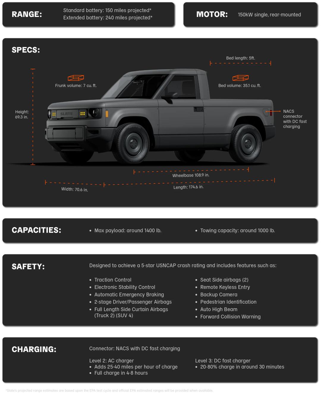 按照 Slate Auto 这是因为大多数美国人每天只开张。 6km ,所以续航就够了,但是,你远行肯定不够。