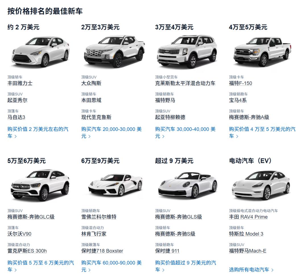 根据美国的购车网站 edmunds 的分类, 2 万美元是买车的底线,脖子哥在网上找了半天,都找不到低于价格的价格。 2 一辆万美元的新车,也就是起亚 Soul 这种小型燃油车可以把起售价打到一定程度 2 万美元,其他的,如丰田卡罗拉、大众捷达、别克昂扬等,都在那里。 2.3 超过一万美元。