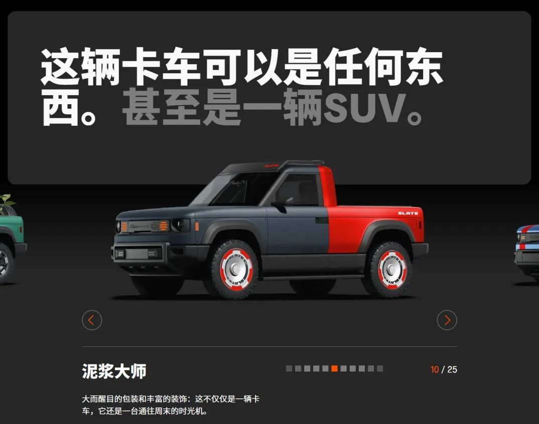 同样因为这个原因,这款车的可玩性非常高。制造商 Slate Auto 的理念是:WE BUILT IT. YOU MAKE IT. (我们制造,你的成就),归根结底就是卖个毛胚房,剩下的装修都交给车主。