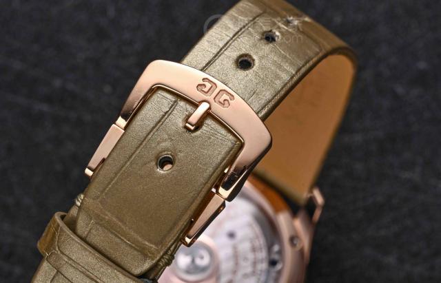 表带也采用绿色调,与表盘相呼应,采用高档鳄鱼皮材质,材质非常精致。总的来说,这款手表的配色和材质使用都非常讲究,表现出内敛华丽的气质。