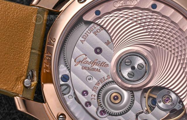 机芯厚度的控制也非常得当,只是为了 3.8 mm,可以保证整块手表的厚度不受影响。机芯的自动摆陀表面装饰有精美的贝壳图案和珍珠图案,以及传统的格拉苏蒂四分之三夹板、带有柱形图案的摆陀夹板、带有旭日图案的减速齿轮等具有代表性的德国元素。从背窗看,机械之美一目了然。