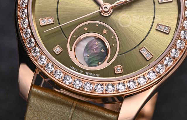 这款手表属于格拉苏蒂,是专门为女性推出的。 Serenade Luna 系列,这个系列 2024 每年正式发布,名字中的 "Luna" 来自拉丁语的“月亮”指出了这一系列的主要特征——月相功能。品牌希望通过这一系列,女性佩戴者也能感受到手腕间天文学的魅力,拥有兼顾实用性和艺术性的佩戴体验。
