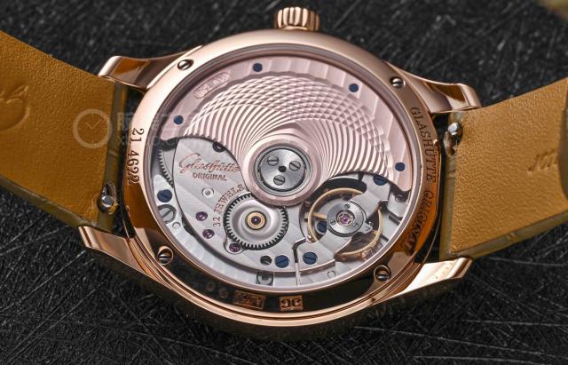 在手表的背面,透过蓝宝石表镜玻璃材质的表底,可以清楚地看到内部搭载的内部。Calibre 35-14 机芯自动上链。作为格拉苏蒂最初的自制机芯之一,它延续了品牌一贯的高水平抛光技术。机芯拥有 28,800 次 / 振频小时,配置 32 宝石轴承,实现动力储备 60 时间足以满足日常使用的需要。该机芯还采用了硅游丝,这种材料具有优异的抗磁性和稳定性,不易受环境变化的影响,从而提高整个行走时间的稳定性。手表支持 30 米防水。