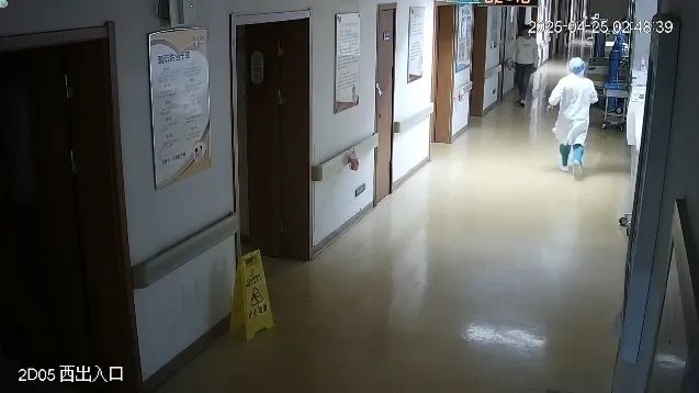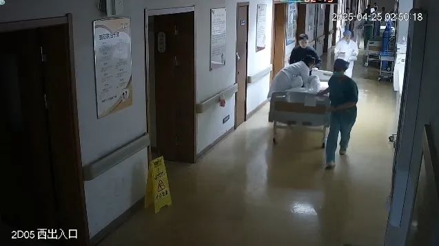 这是凌晨2点48分产科监控的画面。在原本平静的画面中,医护人员突然从不同的方向奔向同一个病房,包括正在值班的王妮博士。