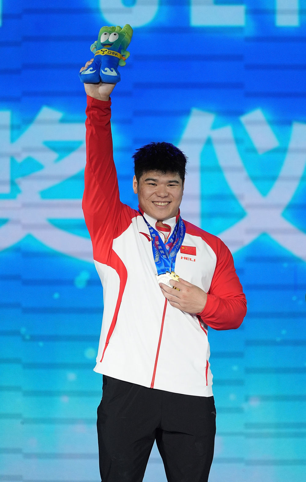 五月十四日,中国选手刘焕华在颁奖典礼上。最终,他获得了挺举,总分两个冠军,抓举亚军。新华社记者 侯昭康 摄
