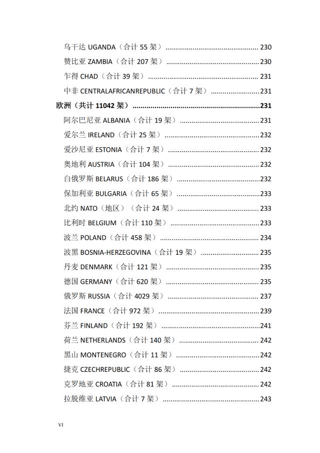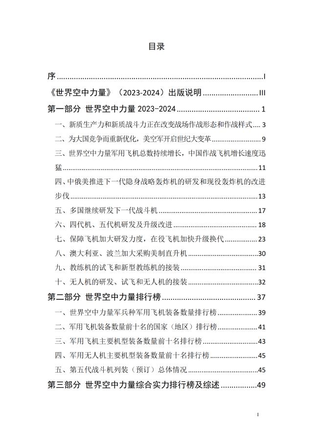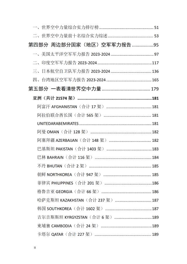 世界空中力量(2023-2024)包括全球空中力量 162 空军、陆军航空兵、海军航空兵、海军陆战队航空兵、国防军航空兵等国家和地区的空中力量汇总。通过图表,报告清晰地向读者展示了军用飞机设备的国家和地区排名,以及世界空气力量综合实力排名以及周边国家和地区空气力量的具体情况。力求全面、系统、有序地为读者提供各种空气设备的具体数量。为深入研究各国(地区)空气力量建设和发展提供更便捷的信息基础;提供一份有价值的分析研究报告,研究如今世界各国(地区)的空气力量编制、设备规模结构、最新采购趋势、型号数量比例等。