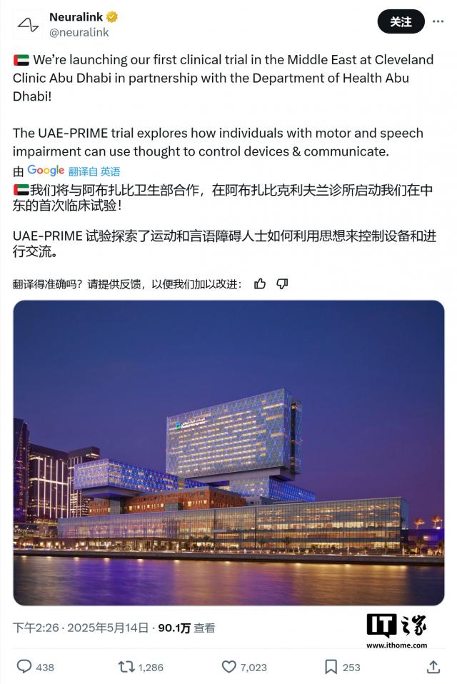 IT 世家 5 月 15 日消息,Neuralink 昨天官方帐号(5) 月 14 日)在 X 该平台发表文章,宣布在阿布扎比克利夫兰诊所与阿布扎比卫生部联合,它将首次在中东启动。 UAE-PRIME 脑机器接入临床试验。