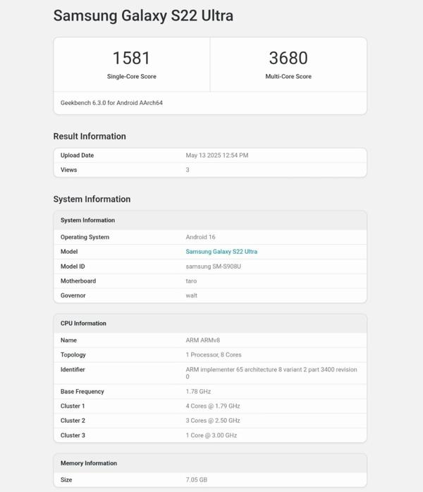 据 X 平台用户 @33333tarunvats 透露,Geekbench 上列举的 S22 Ultra 新固件的运行记录证明,三星将以惊人的速度基于惊人的速度。 Android 16 的 One UI 8 该系统将其推向相关设备。这款 2022 年度发布的旗舰机型首先搭载的是 Android 12 该系统,现在已经接近其四年重大更新周期的结束,One UI 8 这将是它最后一次重大的操作系统更新。初期固件测试显示在更新机器中进行,One UI 8 这是一次轻量级更新,主要集中在更流畅的动画效果和更新的快速共享功能等细微的操作界面调整上。