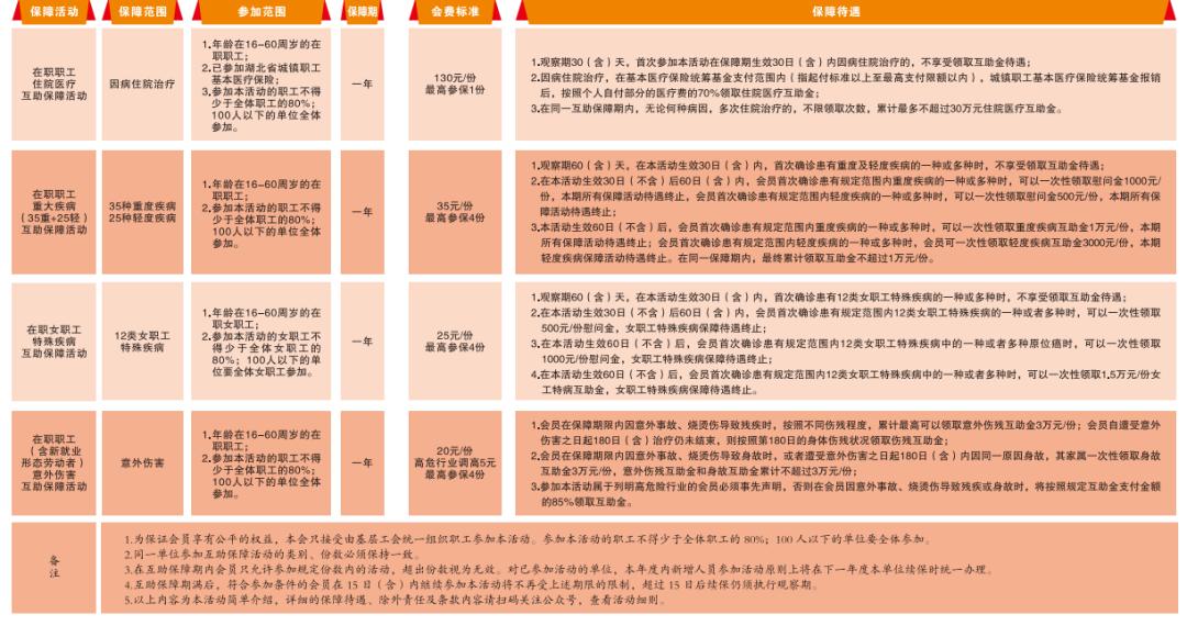 目前,湖北省开展了《在职职工住院医疗互助保障活动》、《在职职工重大疾病(35)四类职工互助保障活动。 25轻)互助保障活动、在职女职工特殊疾病互助保障活动、在职职工(包括新就业形式的劳动者)意外伤害互助保障活动。