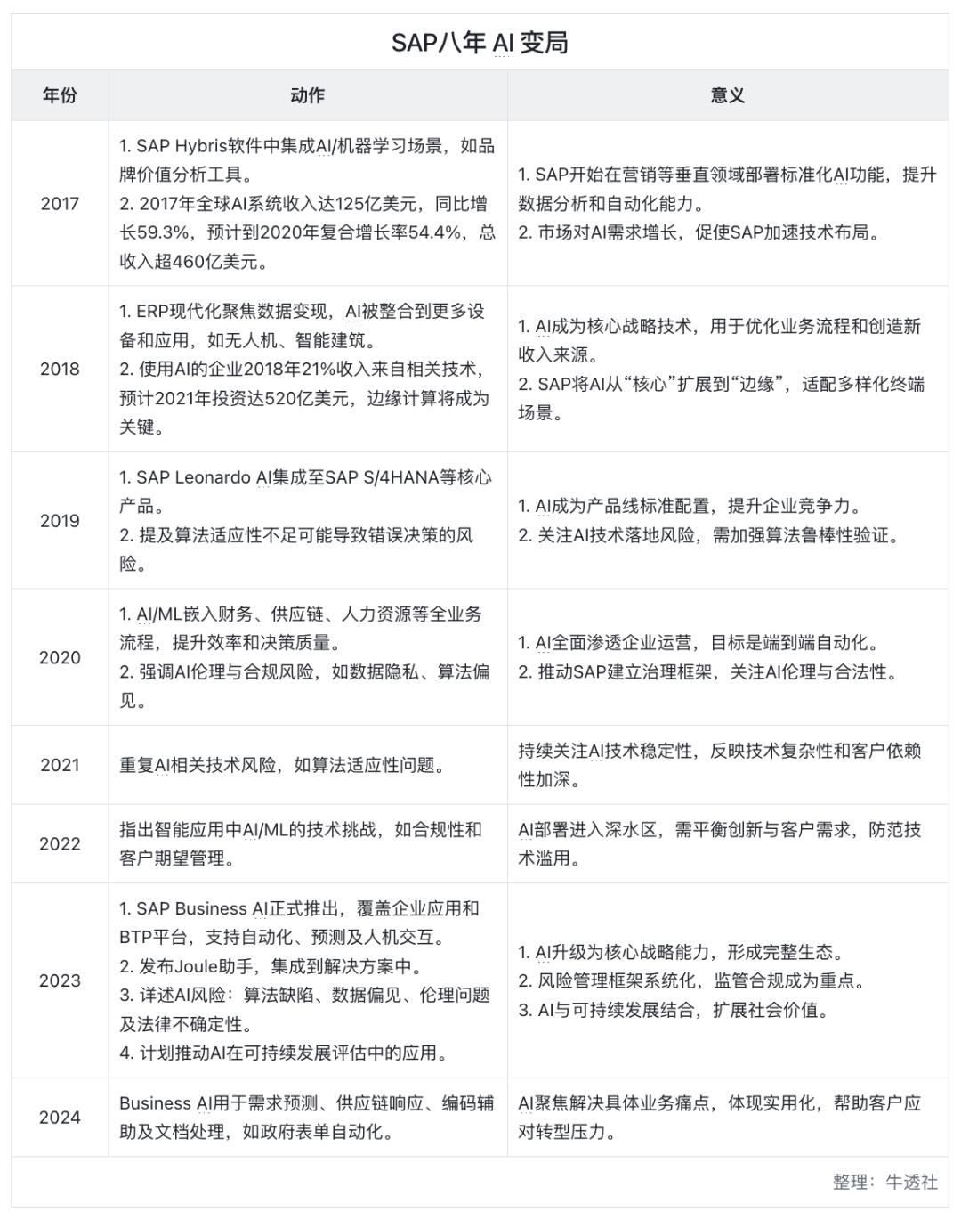 从那以后,我也见证了。 SAP 多年来,中国的每一次转型行动。牛透社翻阅了 SAP 2017 年至 2024 2008年的财务报告,查阅了大量和 SAP 向 AI 试图拆解转型过程中的数据。 SAP 的 AI 转型。