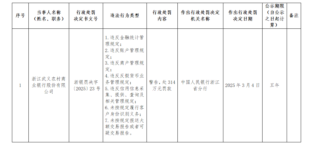 银行财眼|武义农商银行被罚款314万元 因违反洗钱规定等7项违规行为