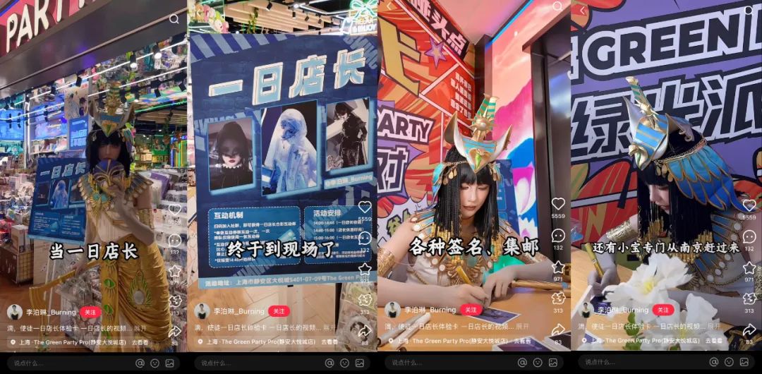 例如,cos第五人格使徒的博主@李泊琳 在上海静安城谷子店当一天店长的时候,玩家和使徒粉丝纷纷与店长“集邮”,有粉丝表示会从南京飞来见博主。
