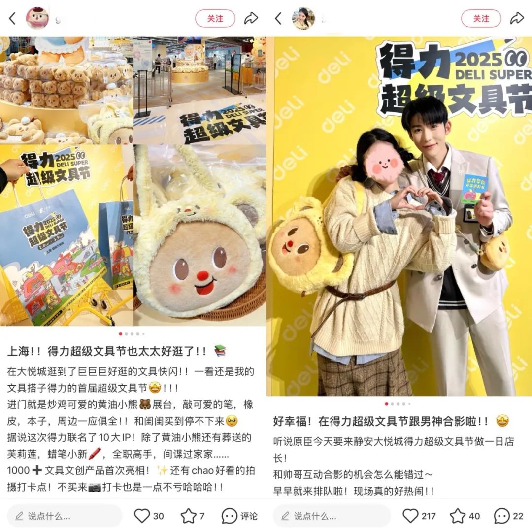 以得力非常文具节为例。活动第一天,店长与10大IP联动的组合拳吸引了1万多人。相关话题在小红书等渠道迅速登顶,线下客流与线上音量产生共鸣。