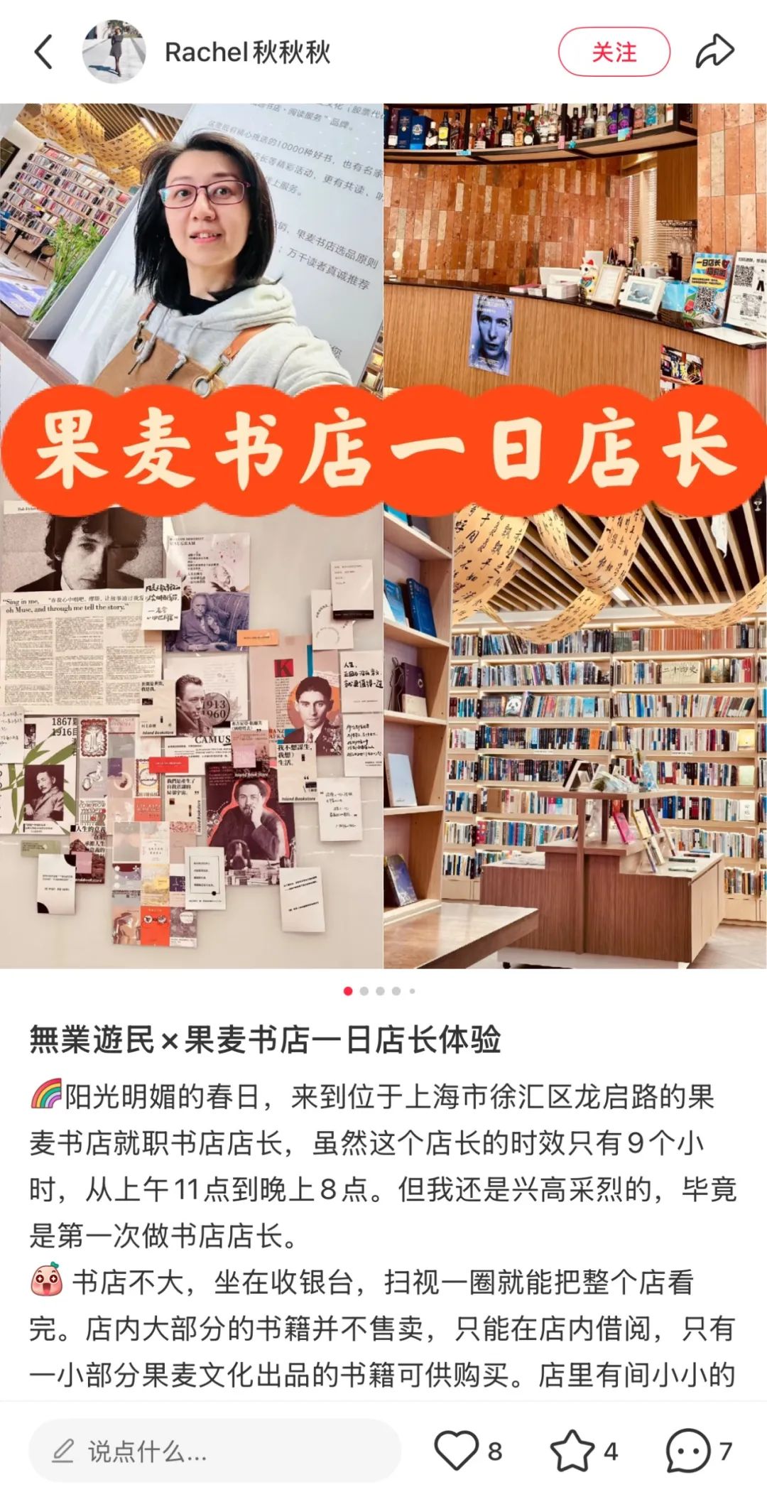 例如,如果麦书店推出许多连续的一日店长活动。博主@Rachel秋秋秋 不但分享自己一日店长的日常工作,还推荐带孩子的家庭关注果麦微信官方账号,共同加入果麦一日店长的体验。