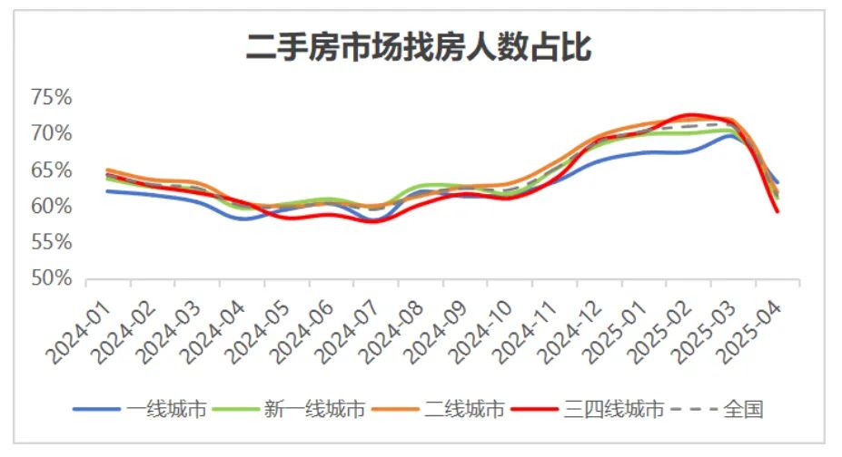 ¡市场份额:2025年4 月二手房找房的比例明显下降至明显下降。 61%,为 2024 到目前为止,各能级城市的比例已经下降,三四线城市减幅最大,市场波动性突出。