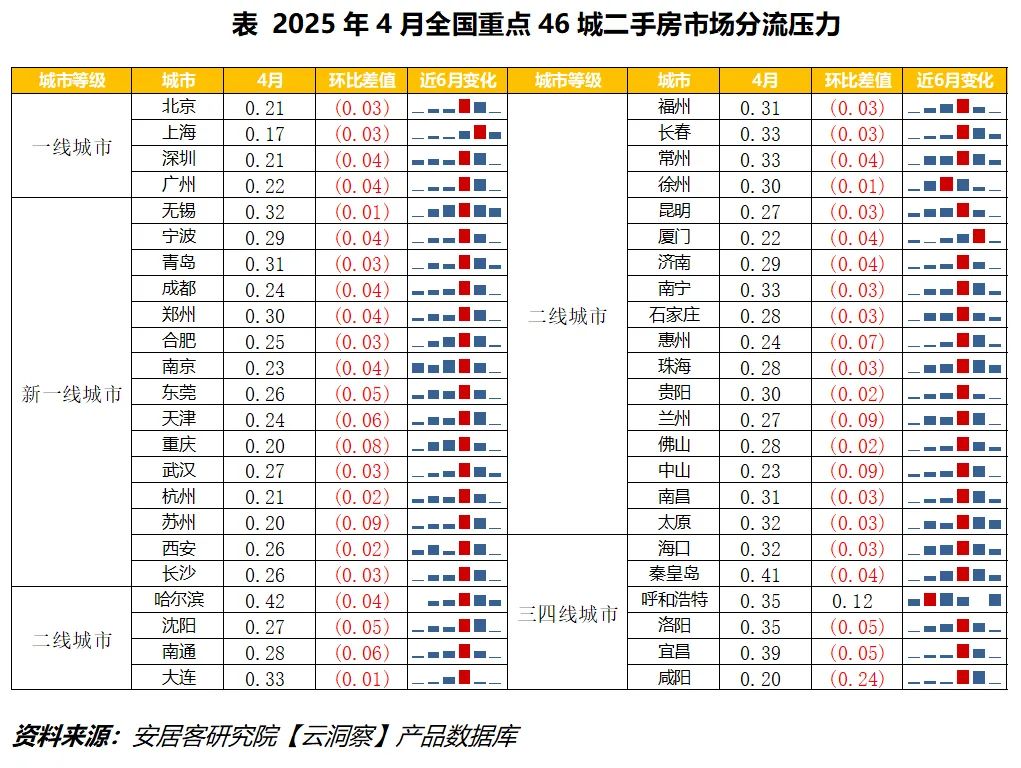 就变化而言,2025年4月全国46个重点城市二手房平均分流压力降至0.28,环比下降0.04。数据显示,除呼和浩特外,46个城市的分流压力均逐月下降。从行业找房人数的变化来看,呼和浩特4月份市场找房人数下降了30%左右,其中新房找房人数下降幅度明显高于二手房,这也是呼和浩特市场二手房分流压力增加的主要原因。