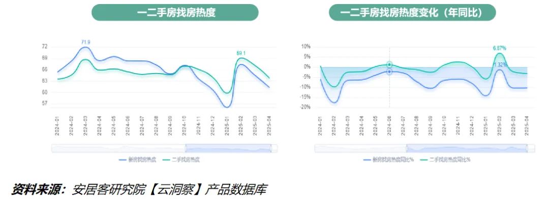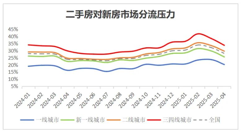 伴随着二手房找房比例的下降,二手房在短期内对新房市场的分流也在减弱。四月份,二手房市场分流压力呈现出明显的回调趋势,其压力值为28%,较三月份环比下降42%。%,这种变化结束了自2024年12月以来的上升趋势,回调到2024年10月的水平。与去年同期相比,2025年4月的压力值比去年同期上升了4个。%,但是,与2025年2月峰值34%相比,累计下降64%%,构成了“缩量下跌-中心移位”的年度特征。2024年年平均值从25.8%上升到2025年前4个月31.0%,上升5.2.%,这意味着二手房市场对新房的分流趋势有所增强,但短期内有所减弱。。