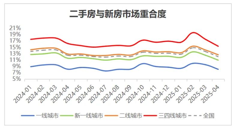 2025年2月,全国重合度达到15%的峰值,但4月份下降到12%。从长期趋势来看,两个客户的平均重叠率保持在13%左右,这表明新房和二手房两个市场客户群体明显分化,两个购房群体各有需求,这意味着新房和二手房之间的竞争压力正在减轻。。