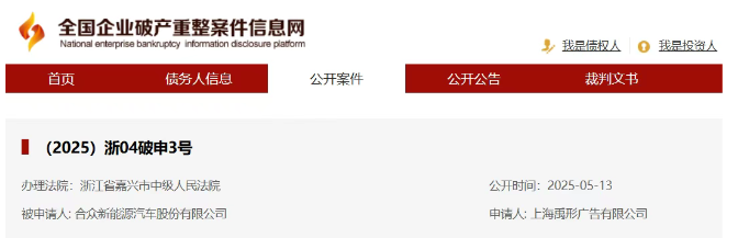 一则消息在2025年5月13日打破了平静。上海禹形广告以“不能清偿到期债务”为由,申请合众新能源破产审查。