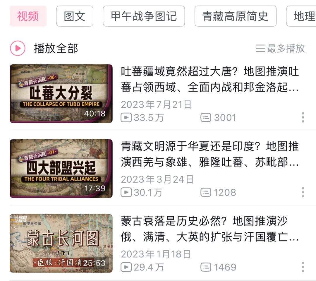 UP主@地图罐头他更喜欢用地图来解释历史问题。比如他用地图推演还原了吐蕃地区的扩张和衰落、蒙古的扩张和死亡等历史典故。