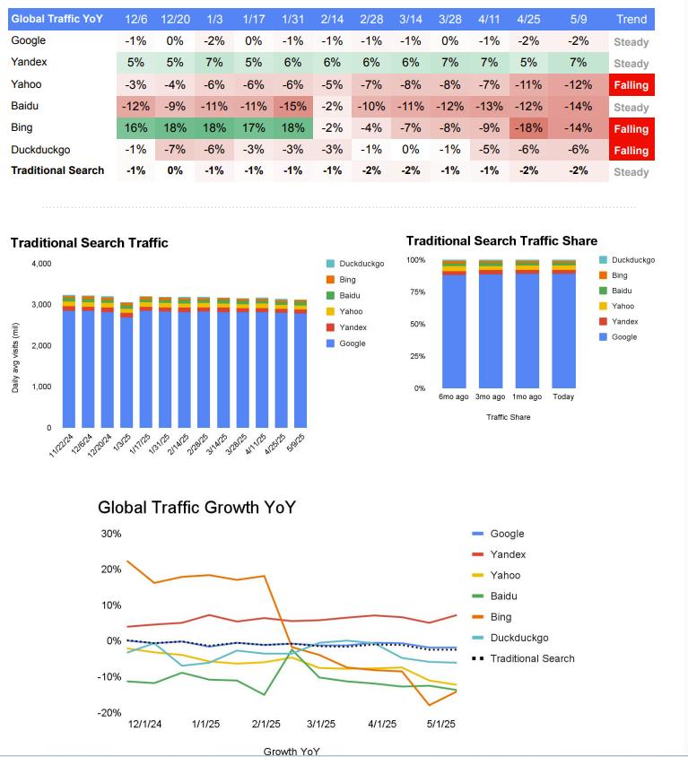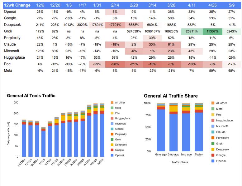 得益于其“无审查、智能化强大”的品牌定位和与埃隆·马斯克的联系,Grok流量在3月份飙升了1,000,000%(与12周前相比),但在5月初只增加了5,200%。